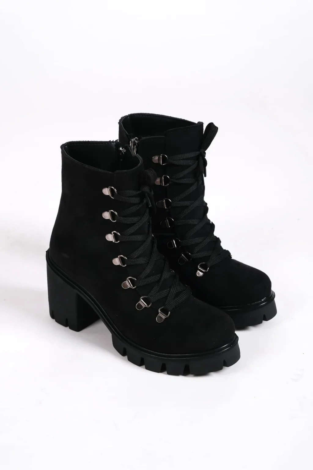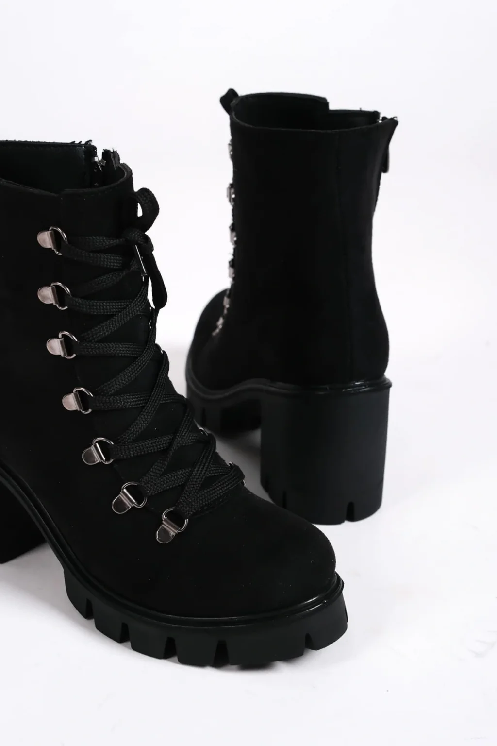 EMMA Bağcıklı Fermuarlı Ortopedik Taban Topuklu Süet Kadın Bot SST - Siyah